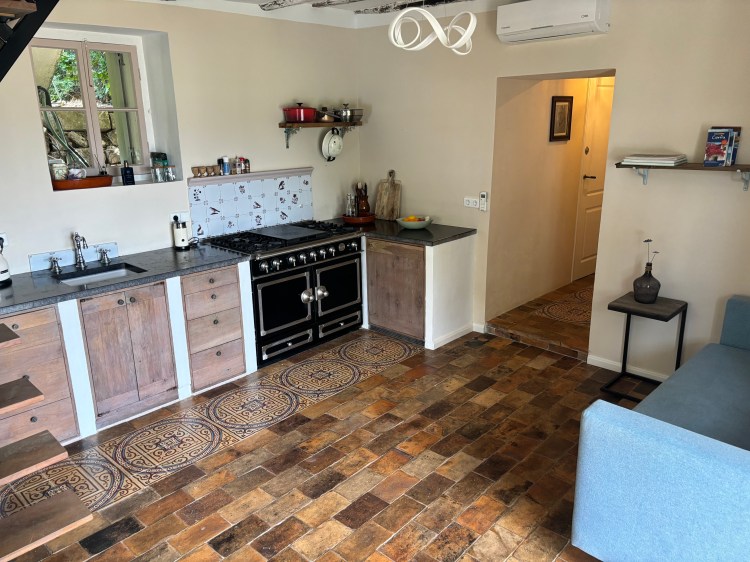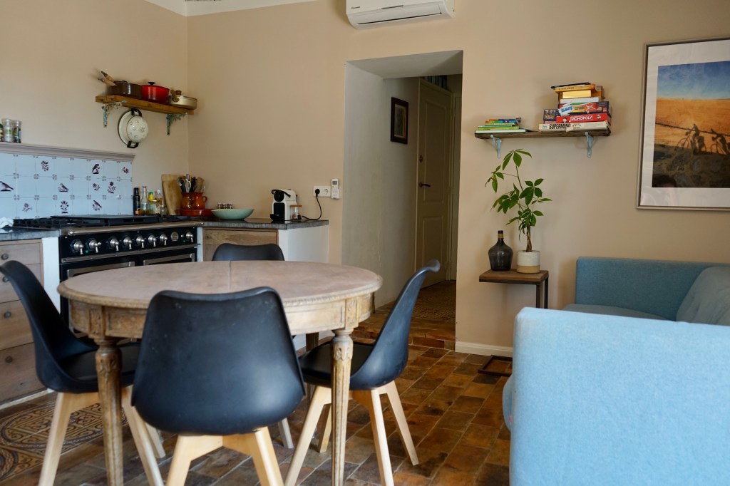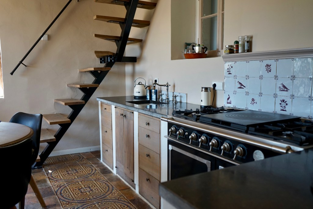 Via de trap loop je naar de woonruimte met keuken. Deze is ingericht met een La Cornue gasfornuis met dubbele oven, koelkast, waterkoker, Nespresso koffieapparaat en melkschuimer. In de bijkeuken bevindt zich daarnaast een magnetron, grote koelkast met diepvries, afwasmachine en wasmachine.