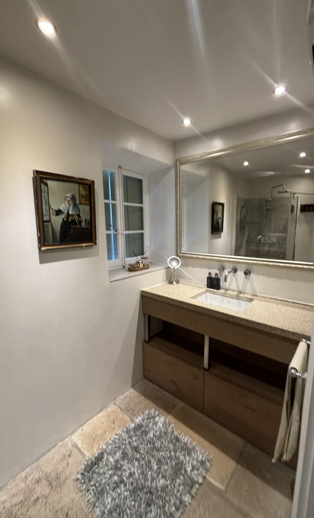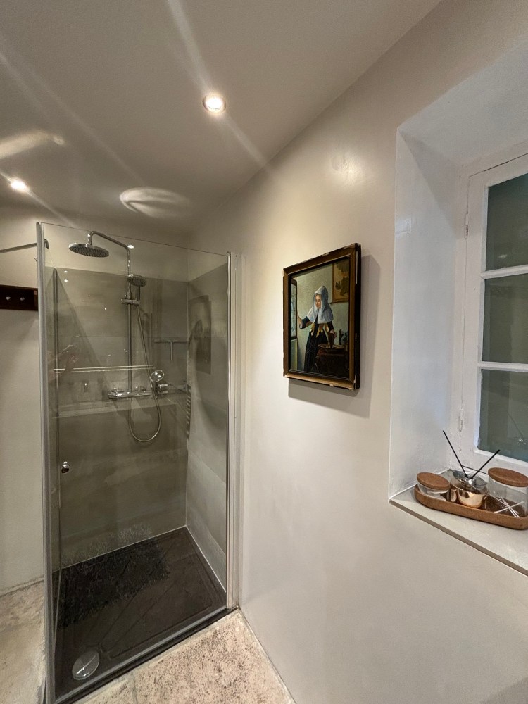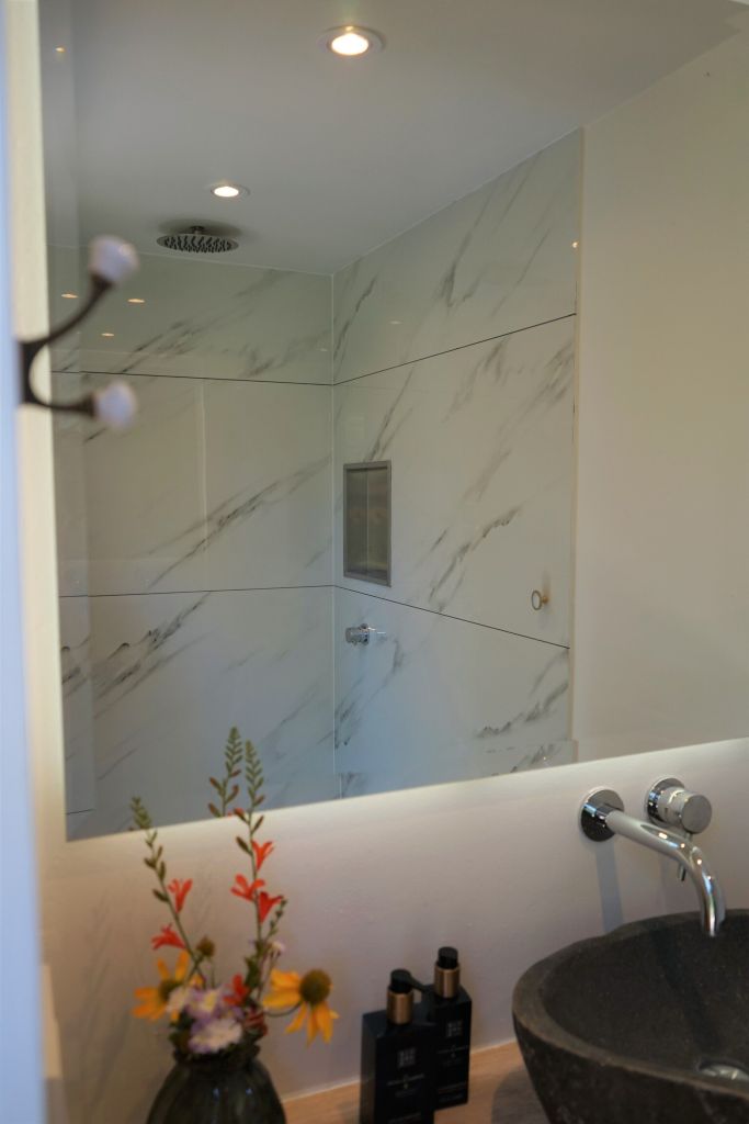 Op de begane grond bevindt zich ook de badkamer en een separaat toilet. In de badkamer staat een wastafel met daarboven een grote spiegel. Ook is er een luxe regendouche met afneembare handdouche. Handdoeken, badlakens en föhn zijn aanwezig.
