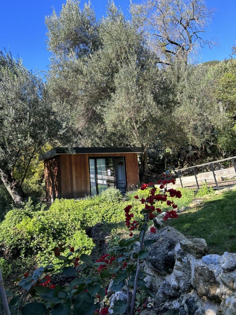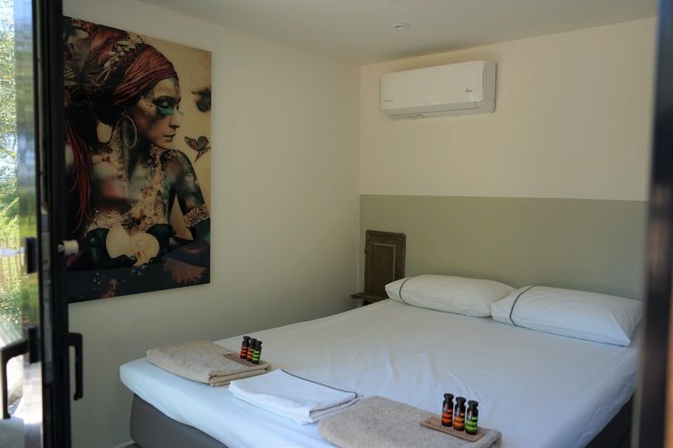 Achter in de tuin bevindt zich het guesthouse: een sfeervolle derde slaapkamer met eigen douche en toilet, ideaal voor gasten die wat extra privacy wensen.